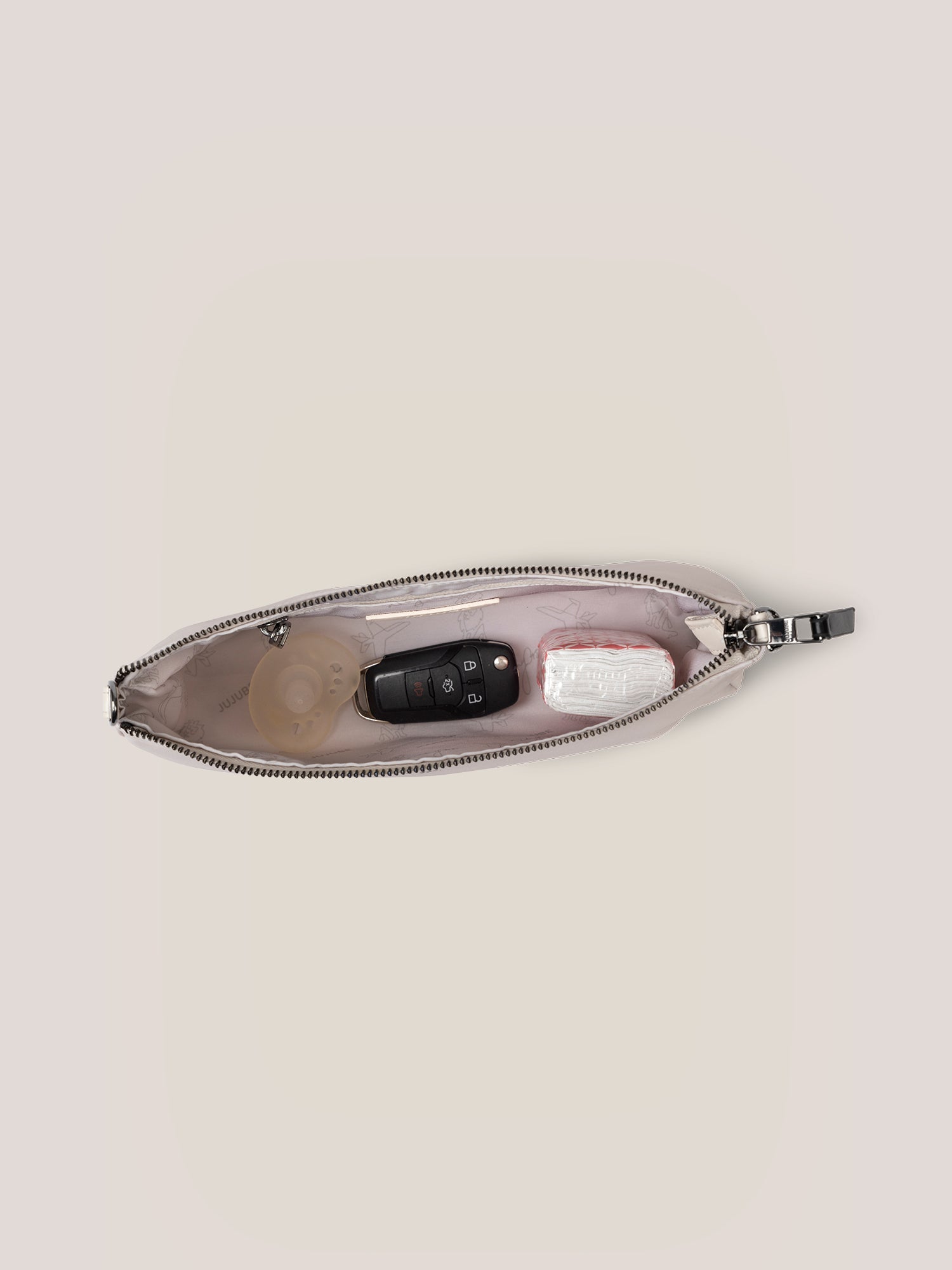 With the chic 3-Piece Pouch Set from Witney Carson | JuJuBe, you’ll never misplace your most important items again! Designed to fit in the front pouch of every JuJuBe diaper bag, these practical and chic pouches will become your everyday go-tos. Use them to keep your essentials in one place. Pack up your keys, wallet, cell phone, sunscreen, band aids, makeup, and other items you can’t leave the house without, and transfer your pouches to whichever JuJuBe bag you choose to carry that day! In classic black and neutral tones, each pouch features gunmetal hardware, black vegan-leather zipper pulls, and a machine-washable lining with Witney Carson's signature print.